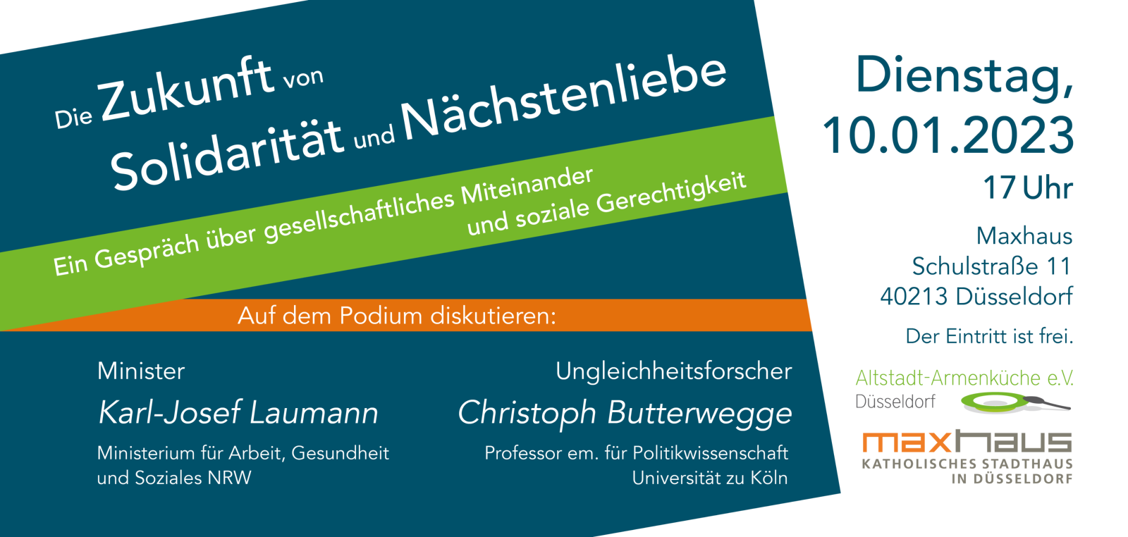 Die Altstadt-Armenküche und das Maxhaus führen den Diskurs zu den aktuellen Fragen sozialer Gerechtigkeit fort: Was ist Solidarität, was Nächstenliebe? Auf welchen Werten beruht eine gerechte Gesellschaft? Wie entstehen Übereinstimmung und Zusammenhalt? Welche Aufgaben haben Politiker*innen und welche Möglichkeiten die Zivilgesellschaft? Ein Politiker und ein Wissenschaftler begeben sich ins Gespräch – und alle Gäste sind eingeladen, Fragen zu stellen und eigene Impulse zu setzen.