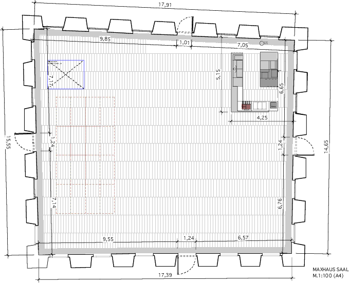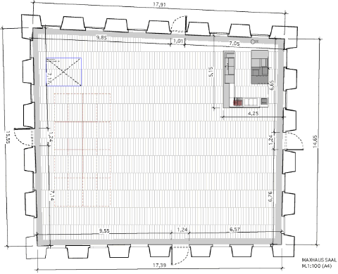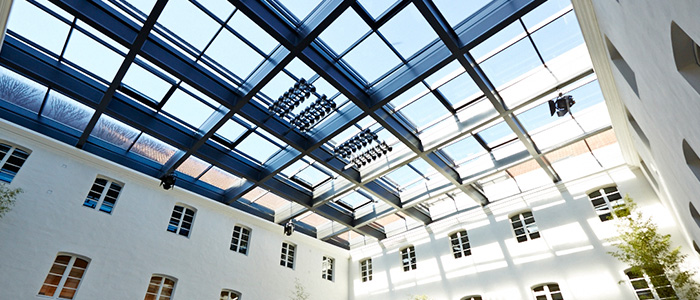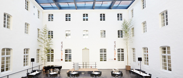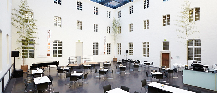 Der glasüberdachte Innenhof des ehemaligen Franziskanerklosters ist der zentrale, die Ebenen verbindende Raum des Maxhauses. Mit seiner 265m² Grundfläche bietet er ausreichend Platz für bis zu 190 Personen. Dank der Stahl-Glas-Dachkonstruktion in einer Höhe von 11,5m erhält er seinen Außenraumcharakter mit den sich im Tagesverlauf ändernden Lichtstimmungen.