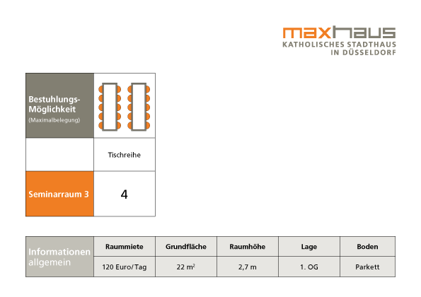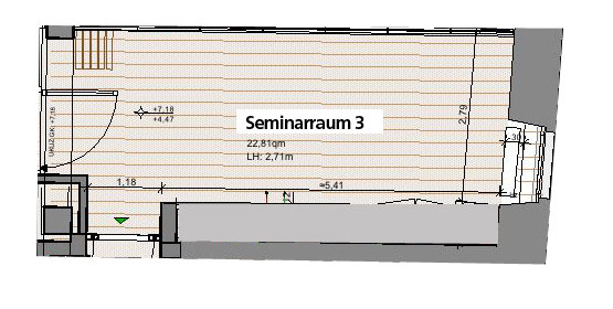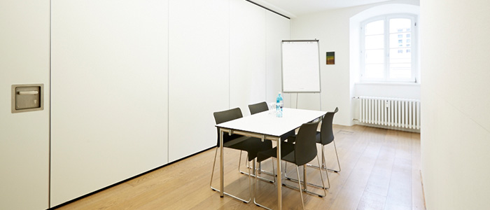 Der Seminarraum 3 verfügt über 22 m² und befindet sich auf der ersten Etage. Er eignet sich für kleine Besprechungen mit maximal 4 Personen.